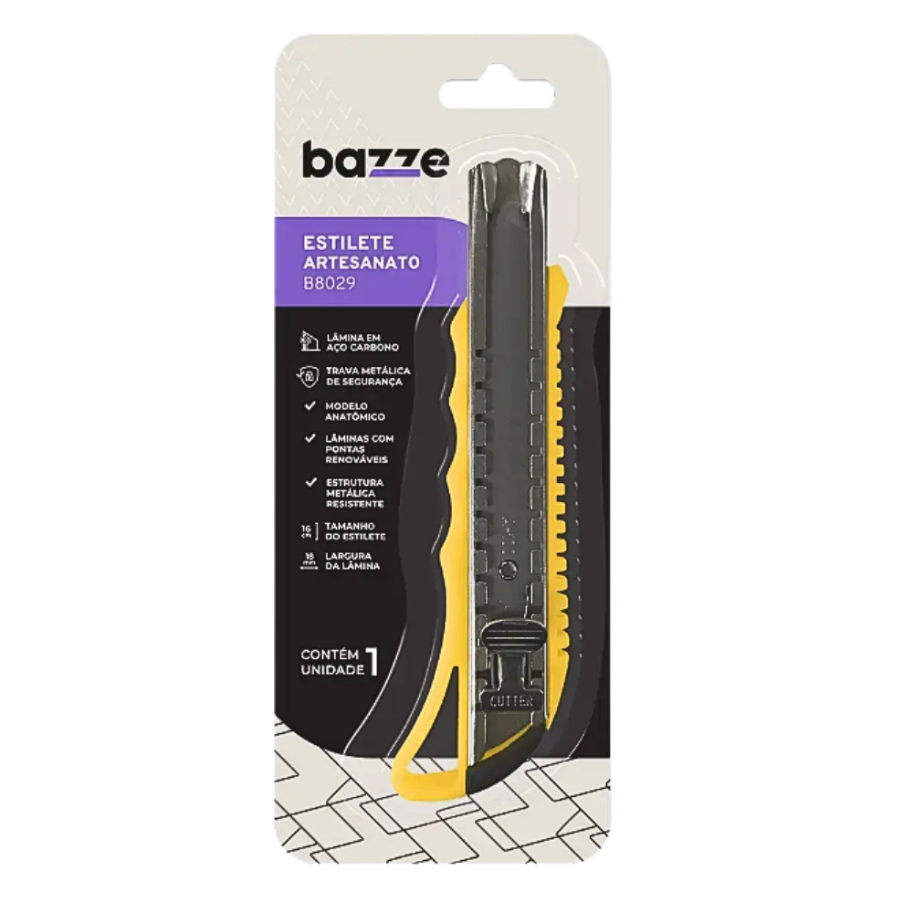 O estilete de metal Bazze é uma ferramenta de corte versátil e robusta. Possui estrutura metálica resistente, formato ergonômico para maior conforto no manuseio, lâmina em aço carbono com pontas renováveis e trava de segurança para evitar acidentes. Durabilidade e praticidade em um só produto.