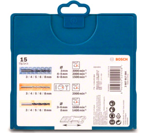 Possui um completo portfólio de brocas com diferentes diâmetros que variam entre 3,0mm e 8,0mm, sendo as de aço rápido para aplicações em metal, brocas com ponta de metal duro para perfurações em alvenaria e brocas de três pontas para aplicações em diferentes tipos de madeira. Acompanha uma caixa robusta que facilita a armazenagem, transporte e acesso de todo o conteúdo de forma bastante organizada. É indicado a utilização em furadeiras e parafusadeiras.
