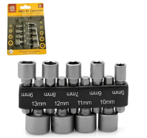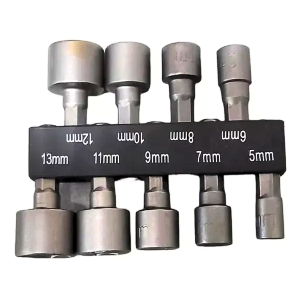 - Kit com 9 peças: 5mm, 6mm, 7mm, 8mm, 9mm, 10mm, 11mm, 12mm e 12mm + suporte de borracha;
